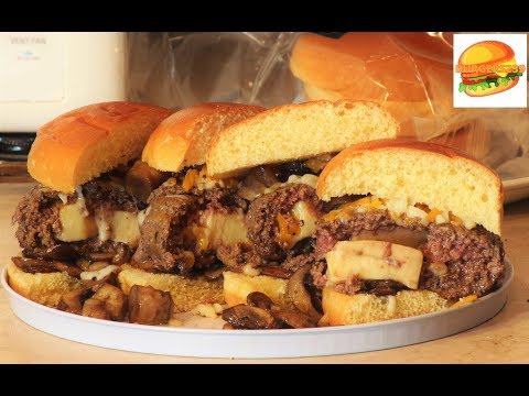 Gruyere stuffed Seasoned Grass-fed Burger with mushrooms and cheddar